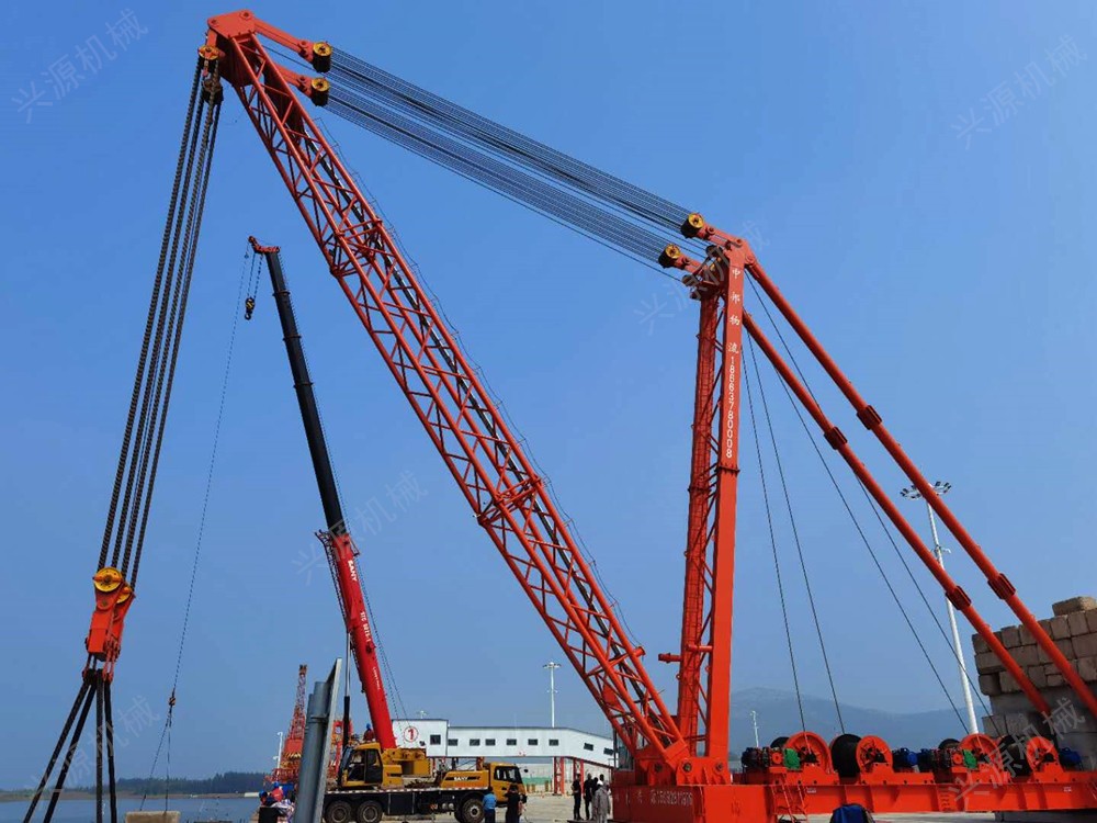 桅桿式起重機(jī)桅桿式起重機(jī),固定安裝的起重機(jī),一般用于港口碼頭桅桿式起重機(jī)又稱為拔桿或把桿,是最簡單的起重設(shè)備。一般用木材或鋼材制作。這類起重機(jī)具有制作簡單、裝拆方便,起重量大,受施工場地限制小的特點(diǎn)。 特別是吊裝大型構(gòu)件而又缺少大型起重機(jī)械時,這類起重設(shè)備更顯它的優(yōu)越性。但這類起重機(jī)需設(shè)較多的纜風(fēng)繩,移動困難。另外,其起重半徑小,靈活性差。因此,桅桿式起重機(jī)一般多用于構(gòu)件較重、吊裝工程比較集中、施工場地狹窄,而又缺乏其它合適的大型起重機(jī)械時。