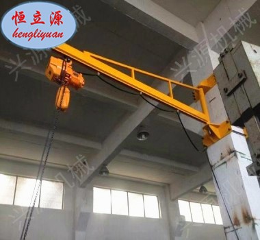 墻壁式旋臂起重機(jī)是根據(jù)用戶需要設(shè)計(jì)的專(zhuān)用起重設(shè)備。具有結(jié)構(gòu)新穎、合理、簡(jiǎn)單、操作使用方便、回轉(zhuǎn)靈活、自重輕、載荷移動(dòng)靈活等優(yōu)點(diǎn),是節(jié)能的物料吊運(yùn)裝備??蓮V泛利用于廠礦、車(chē)間的生產(chǎn)線、裝配線和機(jī)床的上下活及倉(cāng)庫(kù)、碼頭等場(chǎng)合的重物吊運(yùn)。墻壁式旋臂起重機(jī)(墻壁吊)由支架、旋臂裝置及環(huán)鏈電動(dòng)葫蘆等組成。懸臂固定在墻壁或水泥柱上,可根據(jù)用戶需求進(jìn)行回轉(zhuǎn)?;剞D(zhuǎn)部分分為手動(dòng)回轉(zhuǎn)和電動(dòng)回轉(zhuǎn)。環(huán)鏈電動(dòng)葫蘆安裝在懸臂軌道上,用于起吊重物。本機(jī)主要由:懸臂、回轉(zhuǎn)裝置、環(huán)鏈電動(dòng)葫蘆組成。環(huán)鏈電動(dòng)葫蘆有起重和在橫梁上往復(fù)運(yùn)行的功能。懸臂梁可由回轉(zhuǎn)裝置上的的減速機(jī)帶動(dòng)滾輪進(jìn)行回轉(zhuǎn)運(yùn)動(dòng)。電器控制箱安裝在環(huán)鏈葫蘆上。本機(jī)操作通過(guò)手電門(mén)按鈕實(shí)現(xiàn)。手電門(mén)有八個(gè)按鈕,分別控制快升、快降、慢升、慢降、左右回轉(zhuǎn)及葫蘆小車(chē)的水平前后行走。